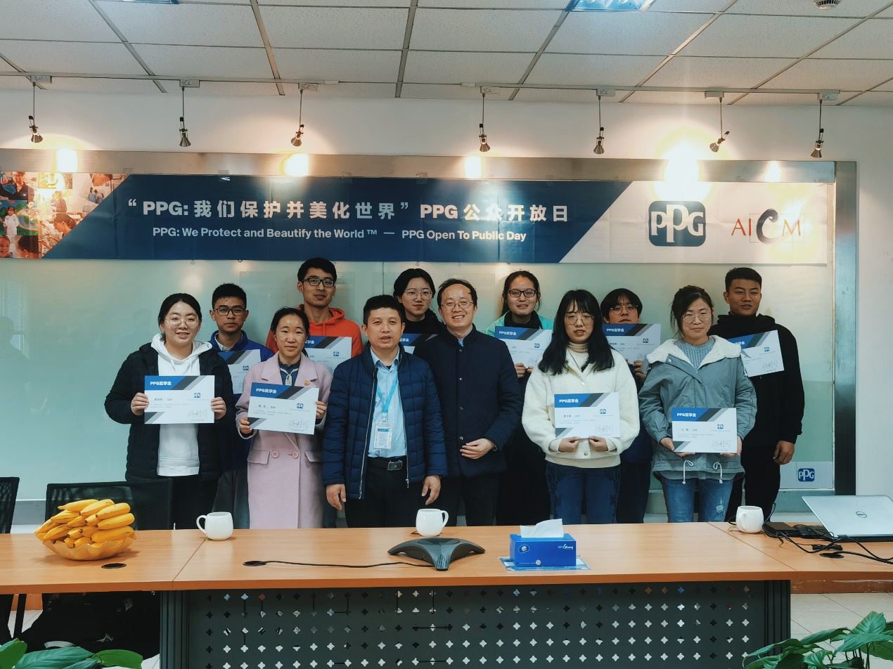 厂长仲基圣先生向在场师生介绍了关于我们,展现了PPG公司百年的雄厚实力及其产品广泛的应用领域,并为此次获奖的10位同学颁发奖学金。PPG管培生计划组成员王延安与大家分享了他在管培生计划中的体验,勉励同学们要保持终身学习的理念,加强自身能力建设。