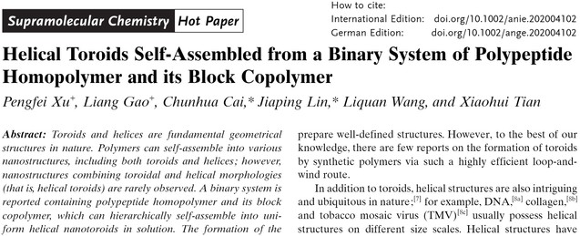 该工作由ylzzcom永利总站线路检测博士生徐鹏飞、青年教师高梁在蔡春华教授和林嘉平教授的指导下完成,相关工作以”Helical Toroids Self-Assembled from a Binary System of Polypeptide Homopolymer and Its Block Copolymer”为题发表在Angew. Chem. Int. Ed. (DOI: 10.1002/anie.202004102),并已入选Hot Paper。