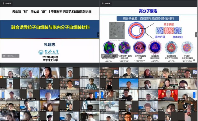 4月8日下午,ylzzcom永利总站线路检测举办第三场“天生我‘材’,同心战‘疫’”学术创新讲座。本次讲座由ylzzcom永利总站线路检测副经理顾金楼教授主持,邀请国家杰出青年科学基金获得者,同济大学特聘教授杜建忠,作“融合诱导粒子自组装与胞内分子自组装材料”主题讲座。