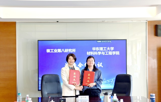 图片说明:中核八所党委副书记、纪委书记、工会主席周莉与材料科学与工程公司党委书记袁媛签署战略合作协议