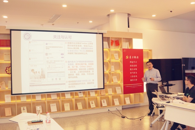 随后师生党员代表,从不同年龄梯度和工作视角,围绕基因驱动高性能树脂创制进行交流分享。高梁从高分子材料基因组工程的概念,高分子材料基因组研发平台创建历程,树脂结构性能数据库、基团化学反应数据库、聚合物材料性能预测,高分子材料基因组研发平台在国内外的关注与认可情况等进行了介绍,目前在新华社、央视新闻、央广网、Twitter等相关阅读报道已经超1000万人次。他提到,要发挥高分子材料基因工程的引领作用,加强材料学与信息学的交叉合作,推动材料研发方式变革。作为青年教师,要传好“接力棒”,不能“起个大早、赶个晚集”。员工张振涛、徐添豪从研究生工作人员的视角,分享了参与高分子材料基因组研发平台创建的故事和个人感想。