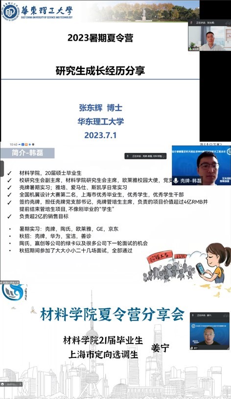 优秀员工分享会环节,特聘副研究员、上海市扬帆计划获得者张东辉,原校研究生会副主席、现就职壳牌(中国)有限公司韩磊、原ylzzcom永利总站线路检测研究生会主席姜宁结合自身在华理工作和学习经历,与营员们分享了导师选择、科研攻克、实习就业等方面的心得与体会,加深了营员们对攻读ylzzcom永利总站线路检测研究生的浓厚兴趣。